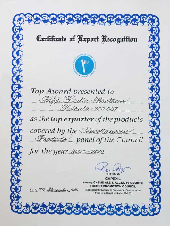 Kedia Brothers are the oldest trader and exporter of Vegetable Tanning Extract (CUTCH). We are first traders to introduce machine made Katha & Cutch (CATACHIN) into the Indian Market. It is an ISO 9001:2008 company. The flagship of the company Kedia Brothers was incorporated in 1956 by Shri Durga Prasad Kedia, the father of Shri Satish Kumar Kedia. The group is managed by Shri Vineet Kedia and Shrimati Isha Singhal Kedia. Mr.Vineet Kedia is a committee member of CAPEXIL ER representing MISC PANEL , committee member CKSMA and committee member of BRC new sports committee. Mr.Vineet is also a fitness n sports enthusiast , marathoner and run across the globe in various events. The group, Kedia Brothers has experience in various fields such as Exports, Imports, Forest Operation, Warehousing, Freight Forwarding, Retail Marketing and many others. From a mere turnover of Rs. 3 Million, the present turnover is over Rs. 700 million. Kedia Brothers is member of various government recognized export promotion council. Our firm has received ‘Top Export Award’ from Capexil and is a Star Trading House recognized by the Govt. of India.